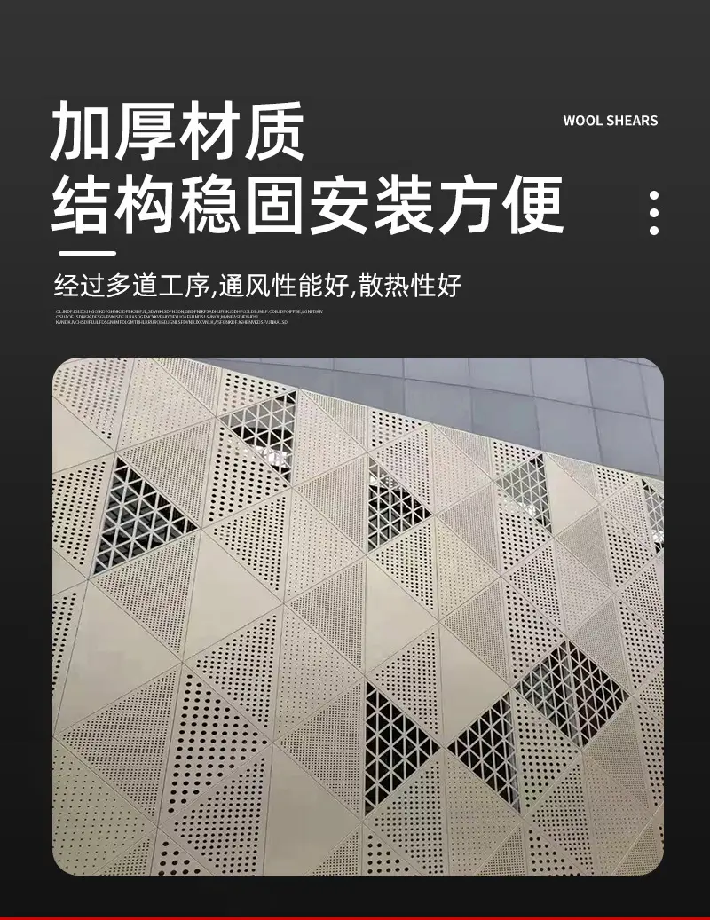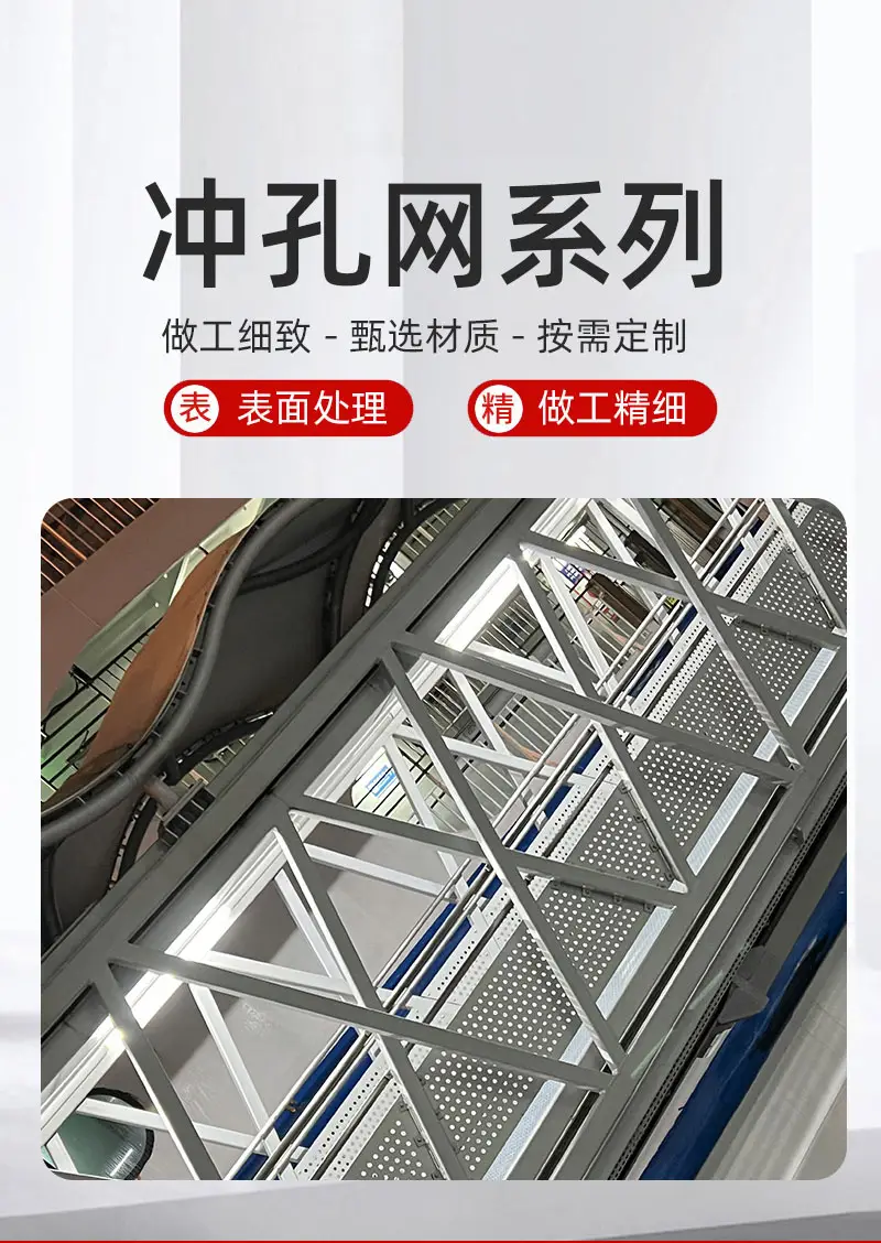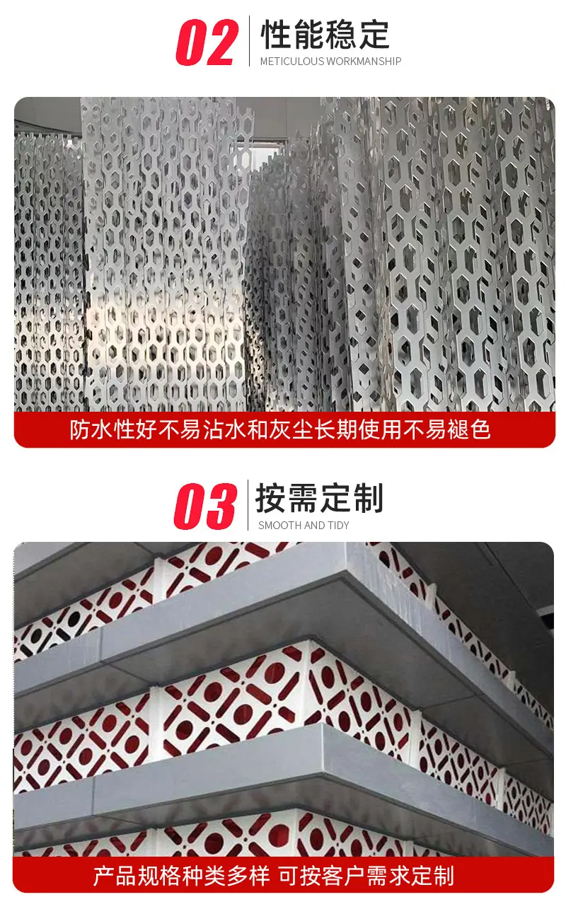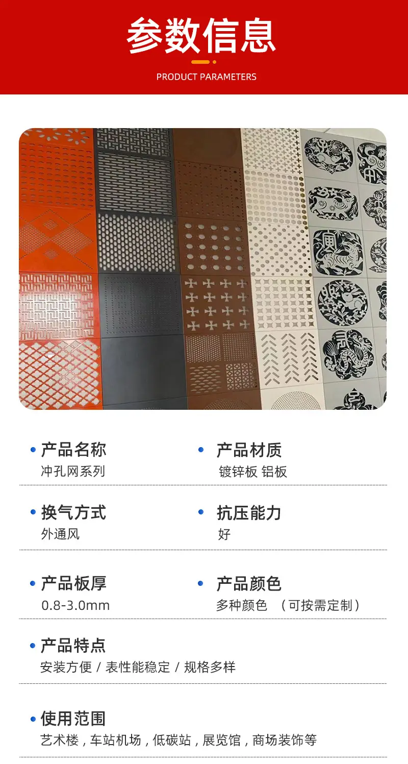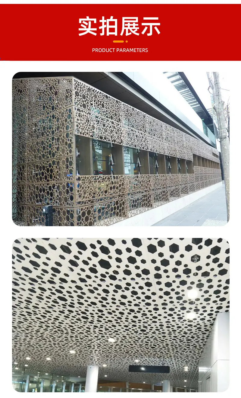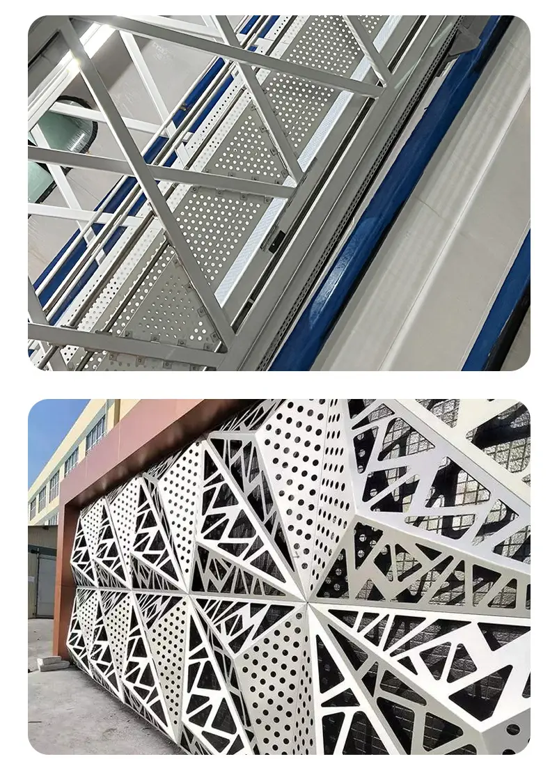 定制化冲孔设计:支持多种孔径、孔型(圆孔、方孔、菱形孔等)及排列组合,满足建筑透光、通风、降噪等个性化需求,同时营造独特的艺术光影效果。