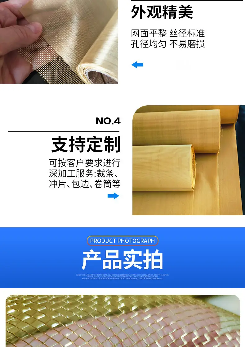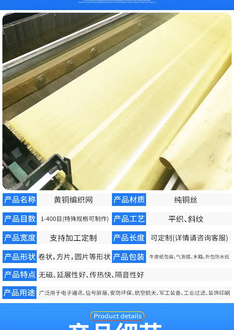 黄铜编织网是一种高性能金属网状材料,采用优质黄铜丝通过精密编织工艺制成。它具有优异的导电性、耐磨性、抗腐蚀性和柔韧性,广泛应用于工业、电子、建筑及装饰领域。黄铜编织网不仅强度高、使用寿命长,还具备良好的抗氧化性能,适用于多种复杂环境。产品规格齐全,支持定制,可满足不同客户的多样化需求。作为专业的黄铜编织网生产厂家,我们致力于提供高品质、合理价格的产品,并提供完善的技术支持与服务。