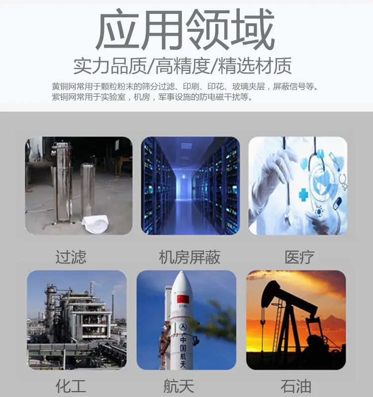 黄铜网是以优质黄铜(铜锌合金)为原材料,经精密编织或冲拉工艺制成的金属丝网产品。具有优良的导电性、导热性、耐腐蚀性和延展性,同时具备良好的机械强度和美观的金黄色泽。黄铜网广泛应用于电子屏蔽、过滤分离、装饰装潢、建筑幕墙、化工设备、仪器仪表、电磁屏蔽、防虫通风等多个领域。