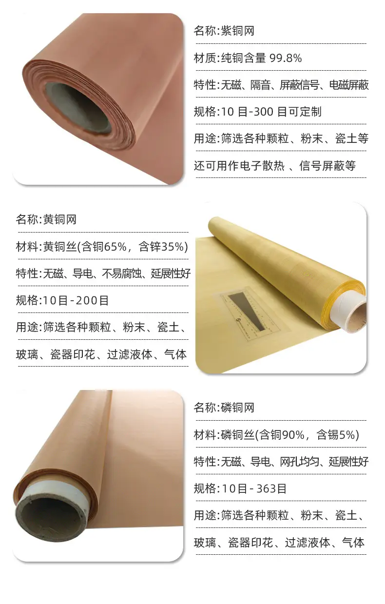 磷铜网:含铜85%-90%,锡5%-15%,耐腐蚀性强,适用于瓷器印花、气体过滤(如医疗设备、精密仪器)。