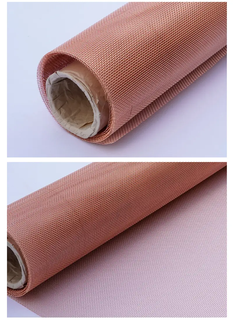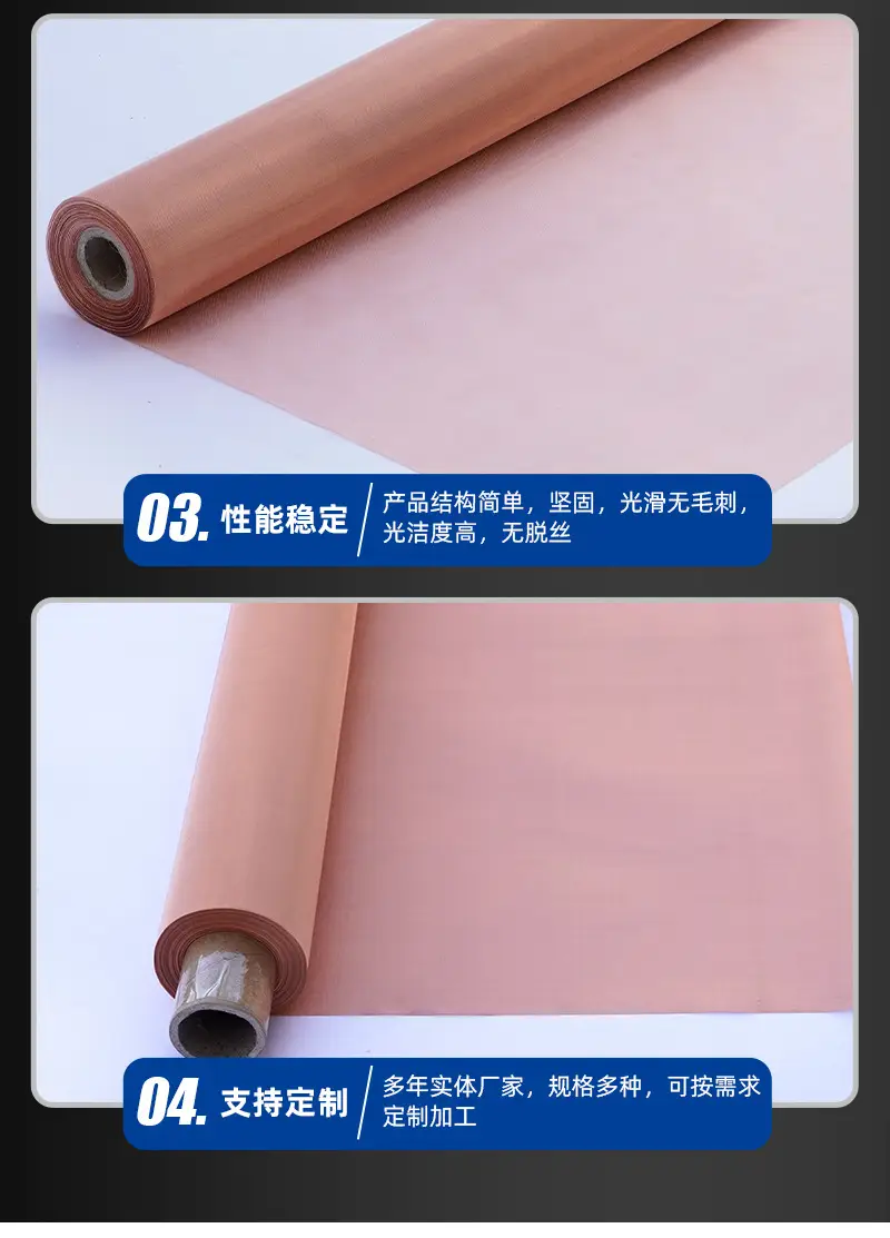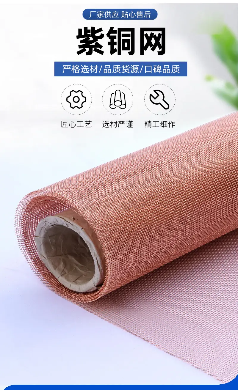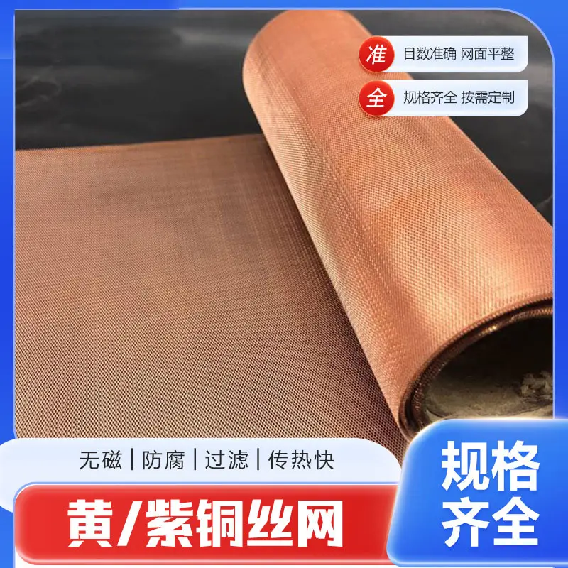 紫铜网是以高纯度紫铜丝(纯铜含量≥99.95%)为原料,通过平纹、斜纹、冲孔等精密编织工艺制成的金属网状材料。其核心特性包括优异的导电性、导热性、耐腐蚀性、无磁性及耐磨性,同时具备电磁屏蔽、散热、过滤、隔音等多重功能,广泛应用于电子、通信、军事、科研、建筑等领域。