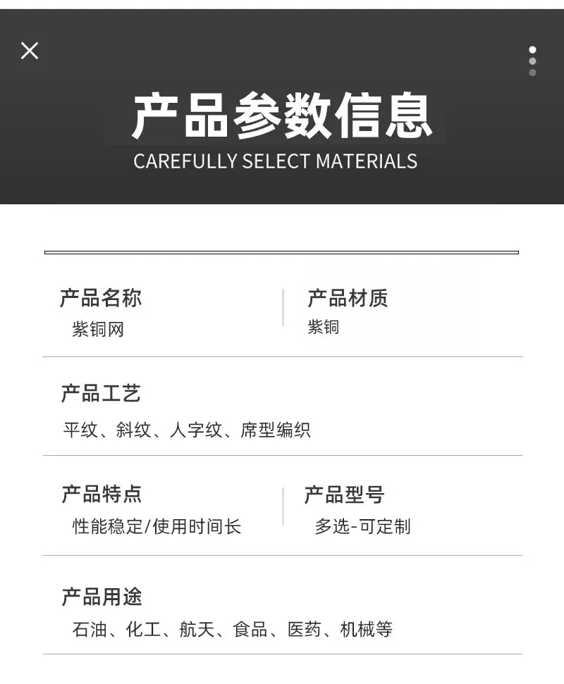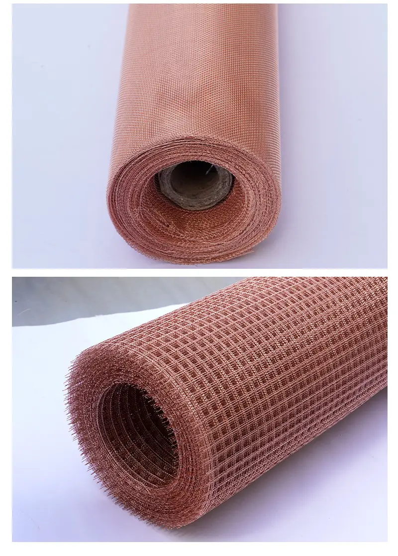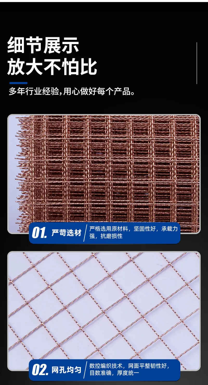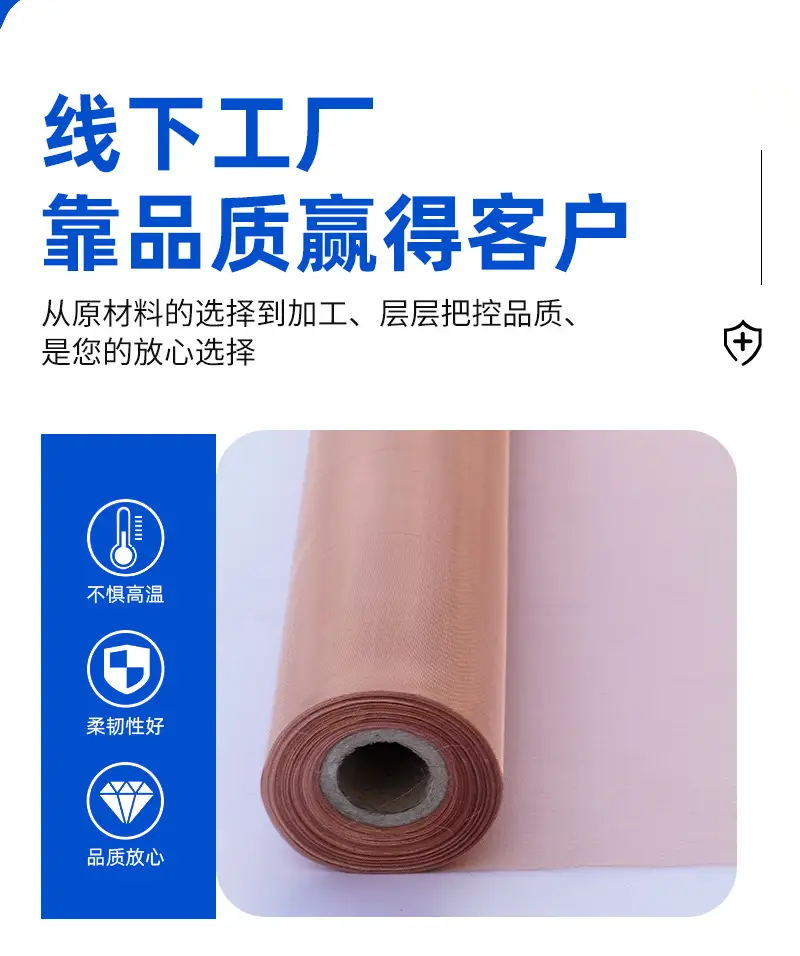 紫铜网是以高纯度紫铜丝(纯铜含量≥99.95%)为原料,通过平纹、斜纹、冲孔等精密编织工艺制成的金属网状材料。其核心特性包括优异的导电性、导热性、耐腐蚀性、无磁性及耐磨性,同时具备电磁屏蔽、散热、过滤、隔音等多重功能,广泛应用于电子、通信、军事、科研、建筑等领域。